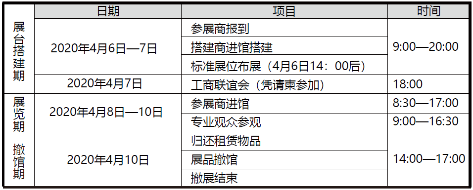 参展商报到时间截止到2020年4月7日15时,未报到且提前未作变更通知者,承办单位有权对其展位另行处理。